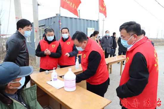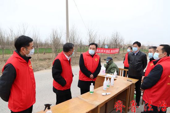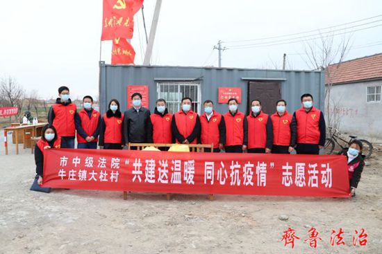 齐鲁法治(东营讯)李春军 3月18日,东营中院党组副书记、副院长赵有明赵有明带领机关党委干警及部分支部党员志愿者到东营区牛庄镇大杜村走访慰问防疫一线干警,开展“共建送温暖、同心抗疫情”活动。东营区委常委、市直驻东营区工作队队长徐文辉陪同慰问。