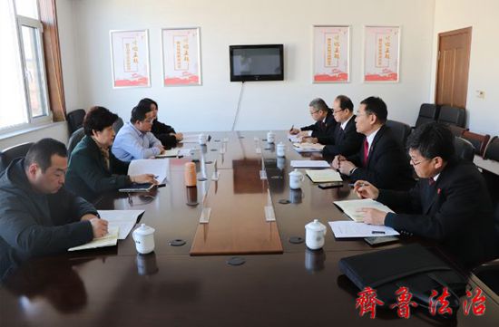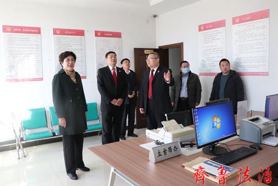 张明磊一行实地查看了陈庄法庭审判庭、诉讼服务中心、人民调解室、法治宣传教育基地等场所,听取了孙学军关于党建工作情况的汇报,并就党组织机构设置、党建品牌创建、特色亮点工作、存在的问题不足及下一步工作打算等开展座谈调研。