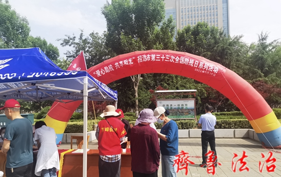 在第三十三次全国助残日来临之际,5月19日上午,烟台招远市法律援助中心在市府前广场组织开展了以“爱心助残·共享阳光”为主题的普法宣传活动。
