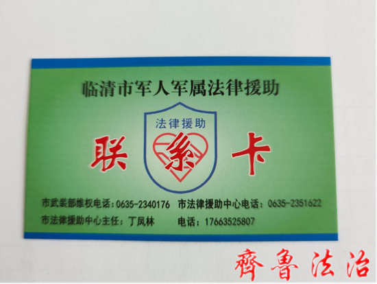 齐鲁法治(聊城讯)于清林 “有了这个拥军联系卡,如果以后在法律方面遇到不明白的事,不用出门,打个电话就可以咨询了。”某军人家属接到临清法律援助中心送给他的《拥军联系卡》激动地说,“太省事了,你们想得可真周到啊!”