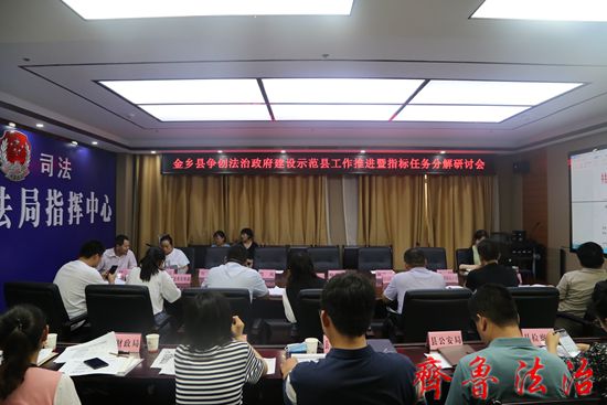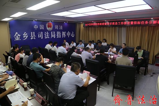 齐鲁法治(济宁讯)李春军 为深入贯彻落实中央及省、市关于法治政府建设的部署要求,推动我县法治政府建设示范创建工作向纵深发展,7月29日上午,济宁金乡县召开争创法治政府建设示范县工作推进暨指标任务分解研讨会。济宁市委依法治市办秘书科应邀参加了会议。县司法局主要负责人、分管负责人以及法治政府建设示范创建责任部门单位相关负责人参加了会议。