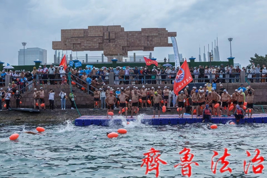 活动现场气氛热烈彩旗飘扬。随着一个个团队整齐下水,六百多名泳友们在波光粼粼的海面上奋勇前行,与蓝色的海水相互映衬,形成了一道独特而壮观的风景线。