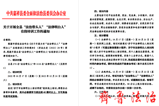 济宁嘉祥县全面安排部署“法治带头人”“法律明白人”在线培训工作。全县共有370名“法治带头人”和1110名“法律明白人”,将在10月17日12月31日依托“济宁市法律明白人培训网校”组织线上