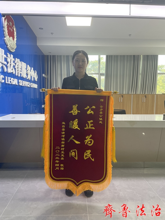 近日,家住鱼台县清河镇相南村的王大妈将一面写着“公证为民 善暖人间”的锦旗送到了济宁金乡县公证处,对金乡县公证处为民解忧的态度、优质高效热情的服务表示诚挚的感谢。