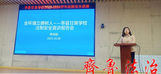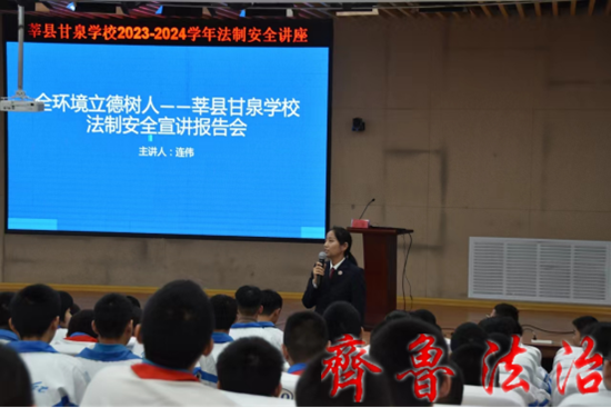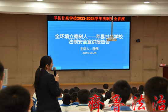 齐鲁法治(聊城讯)于清林 法治教育既是学校教育的重要组成部分,也是学校德育工作的重要内容。为有效预防校园欺凌事件的发生,加强青少年法治观念,增强其安全防范意识和自我保护意识,维护学校的稳定和安全,守护学生的健康成长,10月28日上午,聊城莘县甘泉学校诚邀莘县人民检察院党组成员、检察委员会委员、聊城市第三届青联委员连伟检察官,为甘泉学子开展了一场以“预防校园欺凌”为主题的法治教育专题讲座。