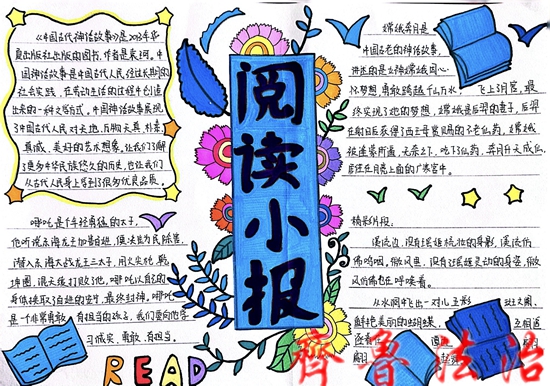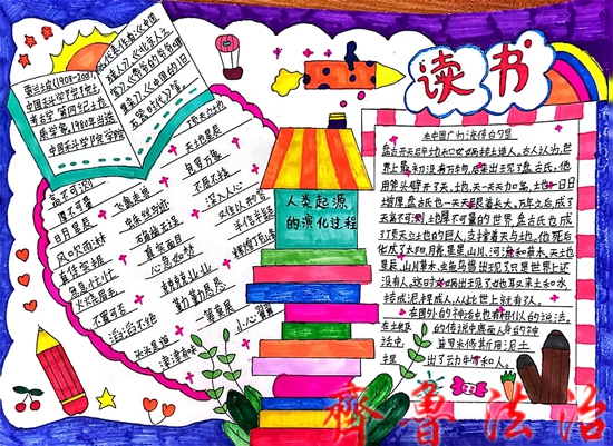 缤纷小报,绘出读书的美好时光;五彩画笔,绘出有书相伴的童年。同学们精心编排,细心写画,构思独特。一张张小报无不体现着孩子们的精心、慧心。