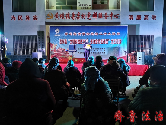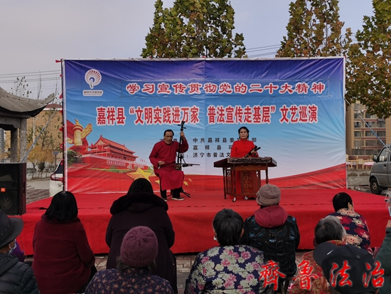 齐鲁法治(济宁讯)于清林 为深入学习宣传贯彻党的二十大精神,全面推进新时代文明实践和“八五”普法工作的开展,进一步做好孝老爱亲、移风易俗、普法宣传等系列工作,切实树立社会文明新风尚,大力加强家庭家教家风建设,充分满足广大群众的精神文化需求,着力提升群众的满意度、获得感、幸福感和知晓率,不断提高广大群众的生活品质,济宁嘉祥县县委宣传部、县司法局联合在黄垓镇黄北村、嘉祥街道护山村、卧龙山街道大山头村、孟姑集镇岳楼村等30个村的法治文化广场开展文艺巡演活动。此次巡演活动从11月24日开始,到12月8日结束。
