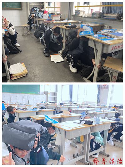 演练开始之前,学校制定了应急演练预案,明确了演练步骤、疏散路线以及各岗位的职责分工。班主任对学生进行了“如何学会预防地震,如何在地震中自救逃生”等安全知识教育。警报响起,各教室内正在上课的师生优先选择课桌(实验台)下方进行避险。避险空间不足则用书包或书本保护头部,在课桌(椅)旁下蹲避险。