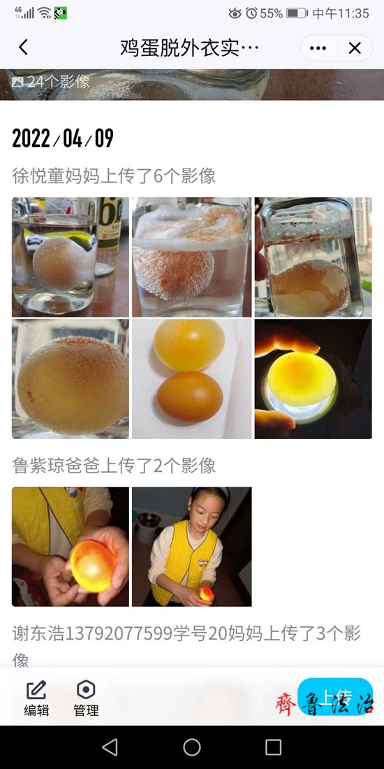 他们把红皮鸡蛋放入白醋中浸泡。第一天鸡蛋全身充满了气泡。第二天,鸡蛋比原来大了好多。第三天,浸泡鸡蛋的醋里面有一些红色的絮状物。第四天,鸡蛋变得更大了。第五天,鸡蛋成功脱去了外衣。当孩子们轻轻用手指肚退去鸡蛋的外壳时,一个弹力球形成啦,他们可以在桌子上轻轻弹跳。