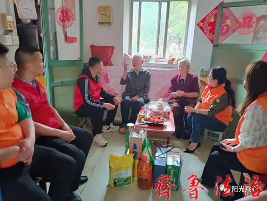 志愿者们在阳光兵心执行理事长杨大胜、世大公益理事长俞香花的带领下,来到威海经济技术开发区崮山镇岭后村,走访慰问丛瑞滋、从玮滋两位退役老兵。在退役老兵丛瑞滋老人家中,90多岁的老兵为志愿者们讲述自己参加解放战争、抗美援朝战争的战斗故事,深深地鼓舞着志愿者们。