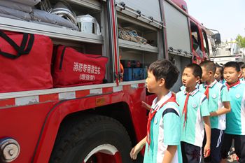 最后,消防员还带小朋友们近距离感受了消防车,带学生上车体验,为他们介绍了消防车上各种消防工具的功能和用途,各班分组流动参观体验,孩子们兴趣盎然久久不愿离去。