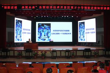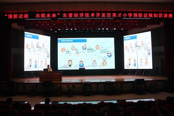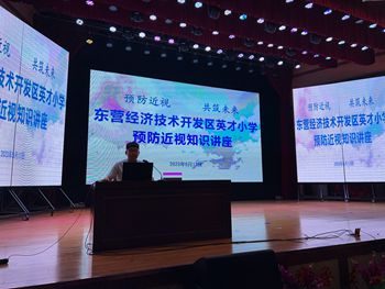2023年5月17日,东营经济技术开发区英才小学在开发区卫健委的支持下,邀请岳视眼科诊所的于强医生为全校师生作“预防近视 共筑未来”近视防护知识讲座。
