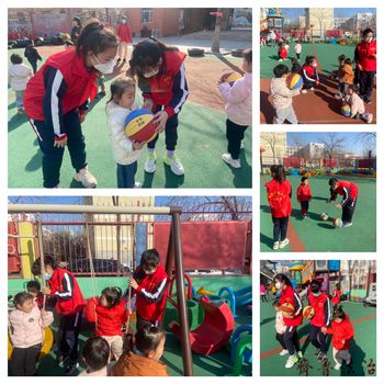 来到幼儿园,小朋友们正在户外活动,学生志愿者们自觉地当起了“护花使者”,帮他们捡球,一起做游戏。
