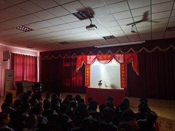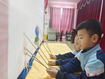表演结束孩子们和老师一起走到幕后近距离感受中国传统文化的魅力,跟于老师学习皮影戏表演,在音乐伴奏下尝试表演皮影戏《三打白骨精》。
