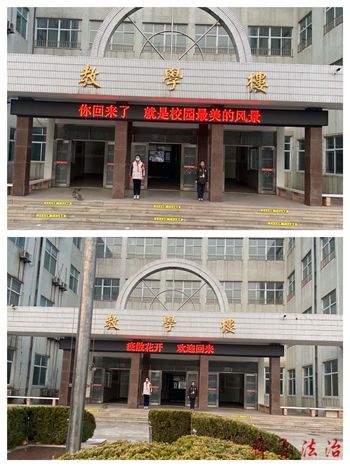 踏进校园,首先映入眼帘的就是温馨的欢迎语“疫散花开,欢迎回来”、“你回来了,就是校园最美的风景”、“校园有你,未来可期”。