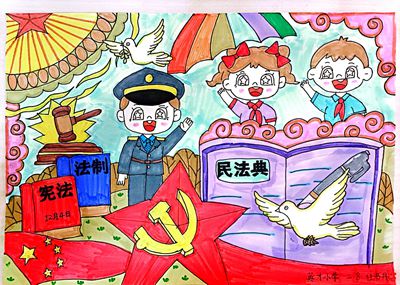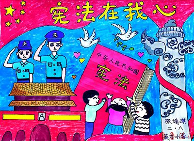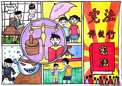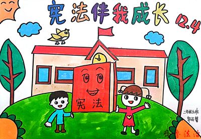 人人都是小画家,小英才手拿五彩画笔,用鲜艳的线条勾画描摹宪法雄伟之姿。