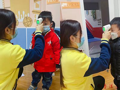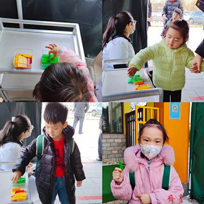 走入幼儿园的大门,第一件事就是确认小朋友的健康状况,做到一测(测温),二看(看精神状态),三查(查口腔),四问(问有无不舒服)。做到不漏一人。所有小朋友都非常自觉、配合,每一位幼儿都能做到按防控要求入园,愿检尽检。