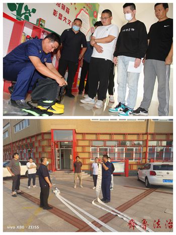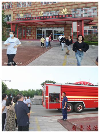 报告完成,消防演练正式开始,在火灾警报声突然响起的情况下,全体教职工迅速按消防逃生疏散线路,分东西楼梯迅速且有序下楼,前往英才广场安全区。在消防车前面,通过现场参观消防车功能,教官讲解消防衣的作用等活动,教师们更为直观地学习了消防常识,大大提高了消防安全意识。刘教官带领学校义务消防队成员,来到教学楼微型消防站位置,培训微型消防站器材的使用,现场讲解消防过滤防毒面具作用,示范、指导消防衣的穿戴,消防水带接口的操作,在广场现场示范了消防水带展开使用等。