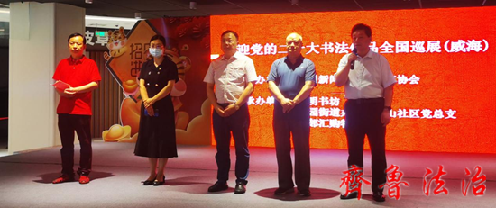 齐鲁法治(威海讯)马丹鸣 7月23日下午,为了热烈庆祝党的二十大胜利召开,由中国新闻出版书法家协会主办,越明书坊、高新区怡园街道办事处古山社区党总支、方邻汇购物中心承办的“喜迎党的二十大书法作品全国巡展”在威海市方邻汇购物中心越明书坊大厅开幕。