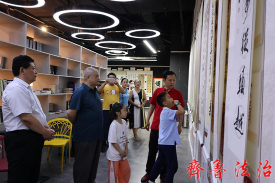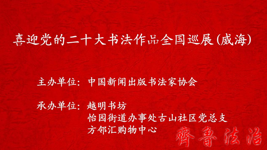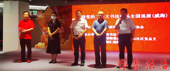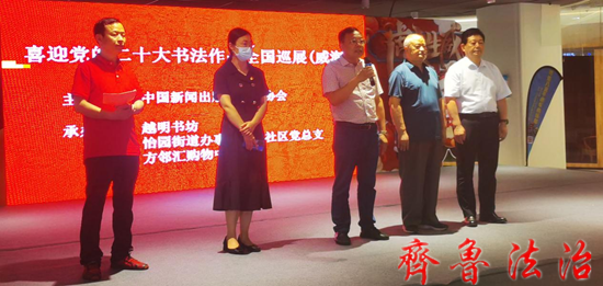 齐鲁法治(威海讯)马丹鸣 7月23日下午,为了热烈庆祝党的二十大胜利召开,由中国新闻出版书法家协会主办,越明书坊、高新区怡园街道办事处古山社区党总支、方邻汇购物中心承办的“喜迎党的二十大书法作品全国巡展”在方邻汇购物中心越明书坊大厅开幕。因疫情原因,中国新闻出版书法家协会主席王云武先生委托协会常务副秘书长、民进中央文化艺术委员会委员、中国文学艺术基金会文创基金秘书长李国富致辞,原威海市委宣传部副部长、威海社科联主席、一级调研员刘昌毅讲话,原威海科学技术协会常务副主席吕少明,高新区怡园街道办事处古山社区党总支书记王明亮宣布开幕,汉字书写解码创立者、中国新闻出版书法家协会教育培训部副主任、哈尔滨工业大学(威海)书院导师杨景舒主持开幕式。