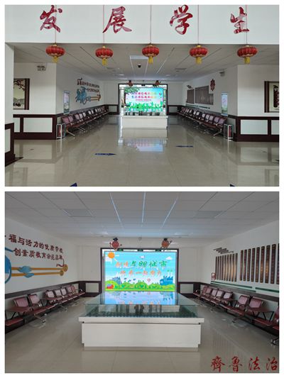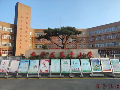 在学校综合楼面向校门口方向的8米电子屏上滚动播出“创建文明城市 争做最美东营人”、“同心共筑中国梦 携手共建文明城”、“关爱未成年人成长 共铸祖国美好未来”等文创城宣传标语。