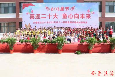 齐鲁法治(东营讯)张龙锐 六月的阳光灿烂夺目,六月的鲜花绚丽多彩,六月的笑脸如花绽放,六月的歌声随风飘扬。在孩子们的期盼中,我们迎来了一年一度的“六一”儿童节。东营区弘文小学于5月31日举行2022年庆“六一”暨特色课后服务成果展演活动。