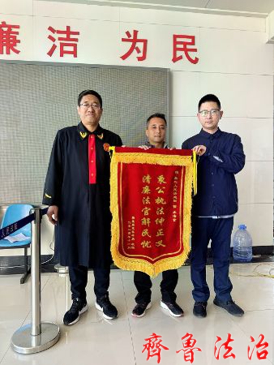 齐齐鲁法治(东营)李广森 11月5日,一起相邻关系纠纷案件的当事人将一面印有“秉公执法伸正义 清廉法官解民忧”的锦旗送到东营垦利法院胜坨法庭,向周乃信法官审判团队表示感谢。