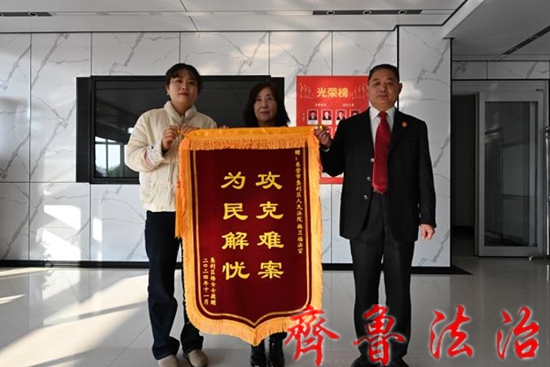11月8日,东营垦利法院执行干警韩卫福收到一面写有“攻克难案,为民解忧”的锦旗,朴素的话语承载着对执行干警公正司法、认真履职的真诚谢意。