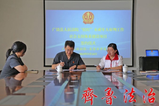齐鲁法治(东营讯)李春军 为深入贯彻落实未成年人保护法,进一步加强未成年人司法保护,9月24日,东营广饶法院与东营市齐家未成年人司法社工工作服务与研究中心就广饶县“桔灯”未成年人审判工作社会支持体系建设项目签署合作协议,引入司法社工机制,开启“法院+社工”未成年人司法保护新篇章。广饶法院刑庭庭长许琦、东营市齐家未成年人司法社工工作服务与研究中心负责人及少年法庭部分干警参加签约仪式。