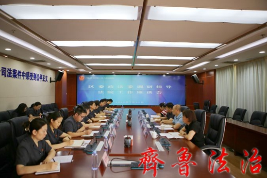 齐鲁法治(东营讯)李春军 7月11日下午,东营市河口区委常委、政法委书记田治宏一行到区法院调研指导工作,并召开座谈会。区法院党组书记、院长梁栋,区委政法委分管日常工作的副书记张成波、相关负责人陪同调研。区法院班子成员及各部门负责人参加座谈会。