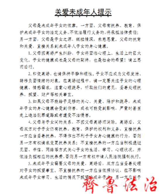 齐鲁法治(东营讯)李春军 5月8日,东营市垦利法院向一起离婚案件的当事人发出《关爱未成年人提示书》,这是在最高人民法院发布《关于在涉及未成年子女的离婚案件中开展“关爱未成年人提示”工作的意见》后,垦利法院发出的首份《关爱未成年人提示书》。