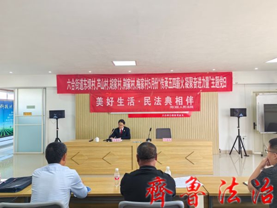 齐鲁法治(东营讯)李春军 5月10日,东营市河口法院民事审判庭庭长徐秀红受邀到六合街道荆家社区党群服务中心参加“六合街道东坝村、芦山村、胡家村、荆家村、梅家村5月份‘传承五四薪火 凝聚奋进力量’主题党日”活动,深度解读《民法典》相关规定。