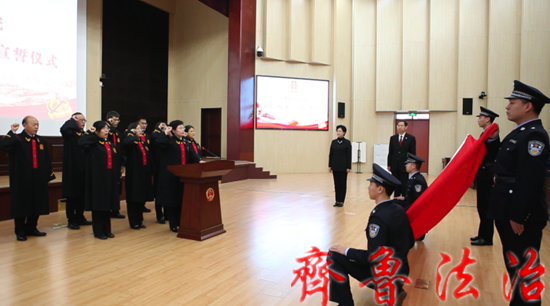 “我宣誓:忠于中华人民共和国宪法,维护宪法权威,履行法定职责,忠于祖国,忠于人民,恪尽职守、廉洁奉公,接受人民监督,为建设富强民主文明和谐美丽的社会主义现代化强国努力奋斗!”新任法律职务人员面对鲜艳的国旗,举起右拳,作出庄严宣誓,铮铮誓言表达了对宪法的尊崇敬畏之情,展示着忠诚担当、公正司法的庄严承诺。两名新任职法官代表作了发言。