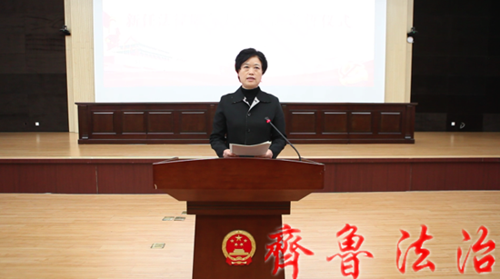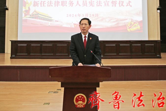 齐鲁法治(东营讯)李春军 东营广饶县十九届人大常委会第十七次会议上,通过了对广饶法院2名审判委员会委员、9名庭长(副庭长)共11名同志的任命。为贯彻落实国家宪法宣誓制度,彰显法律尊严,提高法官职业尊荣、责任感、使命意识,3月29日,广饶法院举行新任法律职务人员宪法宣誓仪式。县人大常委会主任孙翠秀出席监誓并作讲话,广饶法院陈立田院长主持。