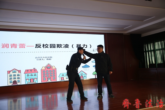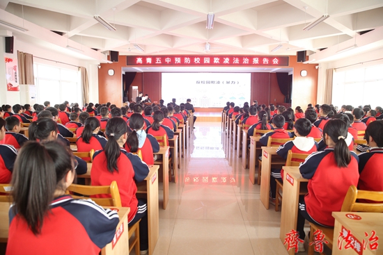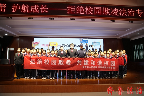 淄博市高青县法院组织干警走进高青县第五中学,开展“拒绝校园欺凌 共建和谐校园”主题普法宣讲活动。