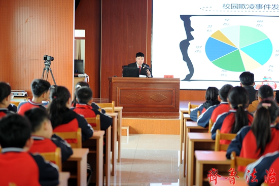 在法治课上,刑事审判庭法官助理韩超结合具体案例以案释法,向同学们介绍了什么是校园欺凌、校园欺凌的表现形式、产生原因以及如何预防校园欺凌。授课干警采取一问一答互动的方式,让同学们深入了解校园欺凌的危害以及掌握正确应对校园欺凌的方法和策略。