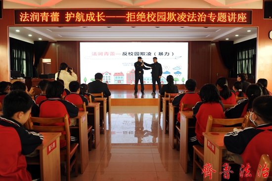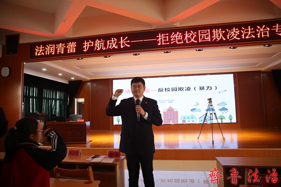 齐鲁法治(淄博讯)田家礼 法润青蕾,护航成长。为进一步加强未成年人法治宣传教育,预防校园欺凌事件发生,营造安全有序、文明和谐的校园环境,3月21日下午,淄博市高青县法院组织干警走进高青县第五中学,开展“拒绝校园欺凌 共建和谐校园”主题普法宣讲活动。
