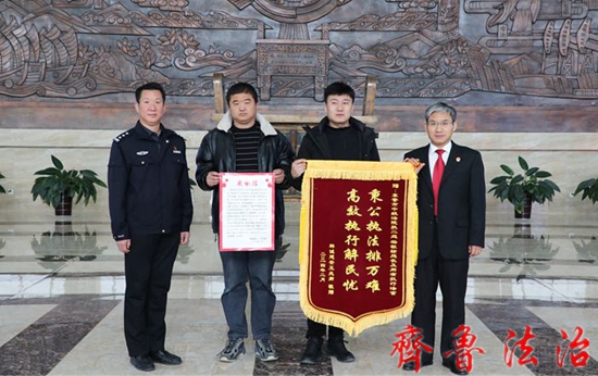 2月28日,某建安公司的王某及雇佣工人,向东营中院送来了绣有“秉公执法排万难,高效执行解民忧”的锦旗和感谢信,表达了对法院执行工作的认可。