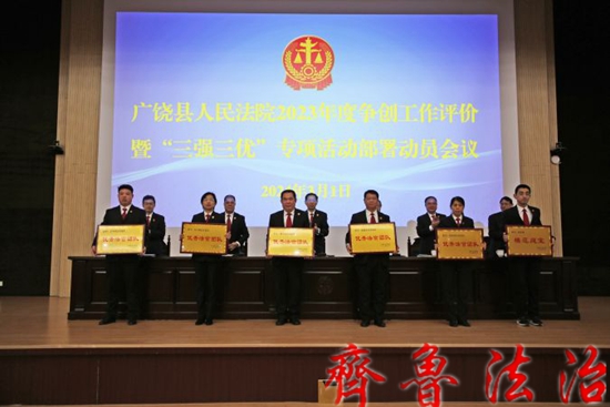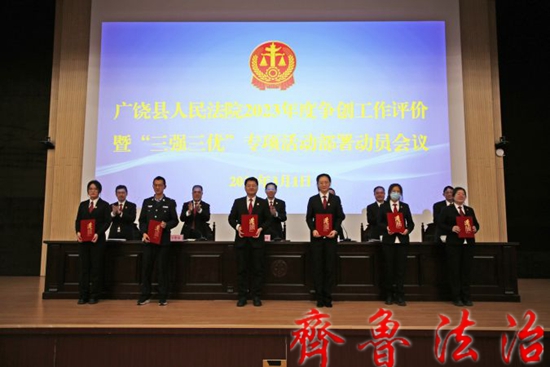 3月1日上午,东营广饶法院召开2023年度争创工作评价暨“三强三优”专项活动部署动员会议,对2023年度“六比八争三创”工作中涌现出的先进集体和先进个人进行总结表彰,对“三强三优”专