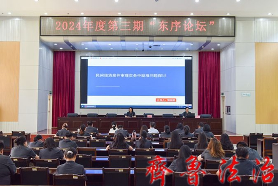 齐鲁法治(东营)李广森 近日,东营区法院“东序论坛”2024年度第三期开讲,民一庭员额法官郭丽娜以《民间借贷案件审理实务中疑难问题探讨》为题授课,东营市中级人民法院民四庭副庭长、四级高级法官王芳,东营区法院全体院领导,审判业务庭庭室全体干警参加。