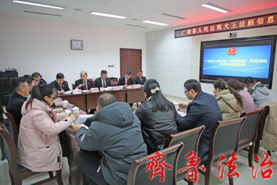 东营广饶县人民法院“四项创建”示范活动征求意见座谈会在大王法庭召开,座谈会邀请部分县人大代表、政协委员、媒体代表、群众代表参加,党组副书记、副院长李玉山主持会议并参与座谈