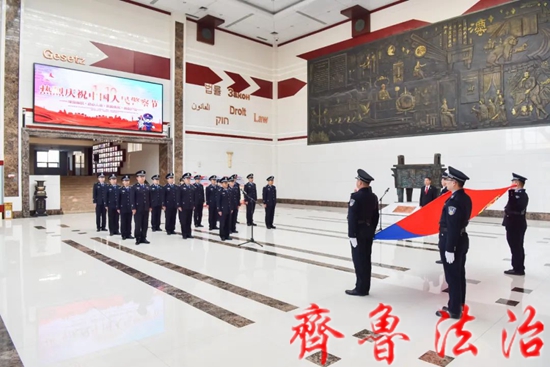 9时许,全队法警整装列队,四名执旗手擎着警旗,迈着坚定有力的步伐来到一楼共享大厅,在庄严嘹亮的国歌声中,全队干警警容严整、精神焕发,高声和唱国歌,唱出了警队独有的豪情和壮志。党组书记、院长丁文强对法警大队2023年度各项工作给予充分肯定,要求全体司法警察谨记习近平总书记重要训词精神和“对党忠诚、服务人民、执法公正、纪律严明”的总要求,牢记初心使命,忠诚履职尽责,勇于砥砺奋斗,做好法院审判执行保障及机关、法庭安全工作,牢固树立全心全意为人民服务的意识,在新的一年里继续发扬艰苦奋斗、奋勇拼搏的精神,切实下实功、干实事、创实效、出实绩。