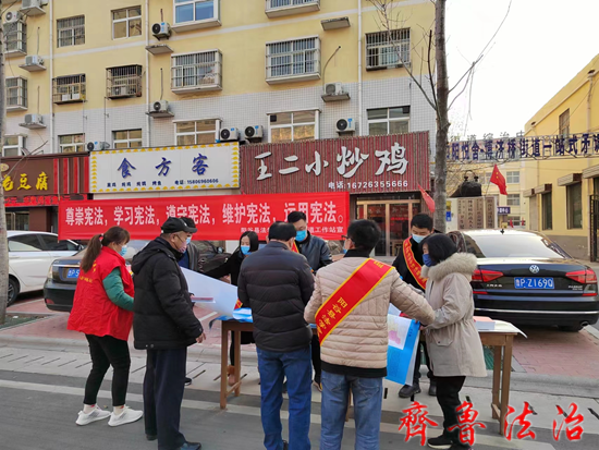 聊城阳谷县司法局博济桥司法所联合街道综治办、法律顾问、人民专职调解员开展12.4国家宪法日法治宣传活动 。