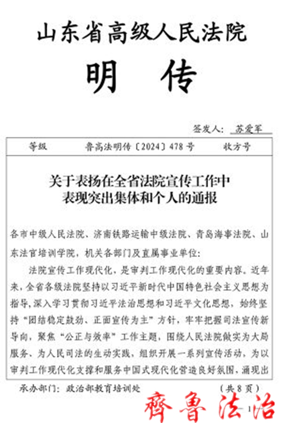 齐鲁法治(东营)李广森 近日,省法院对全省法院宣传工作中表现突出集体和个人通报表扬。东营市东营区法院审判保障中心主任、综合办公室负责人万涛被评为“全省法院宣传工作通报表扬个人”。