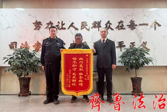 齐鲁法治(东营)李广森 “感谢东营利津法院的法官帮我们要回执行款,还送款上门,我们全家真的非常感激。”申请执行人刘某一边激动地说着,一边代表其祖母将一面书有“执行高效 服务热情 恪尽职守 为民解忧”的锦旗送到执行干警王金涛、董旭手中。