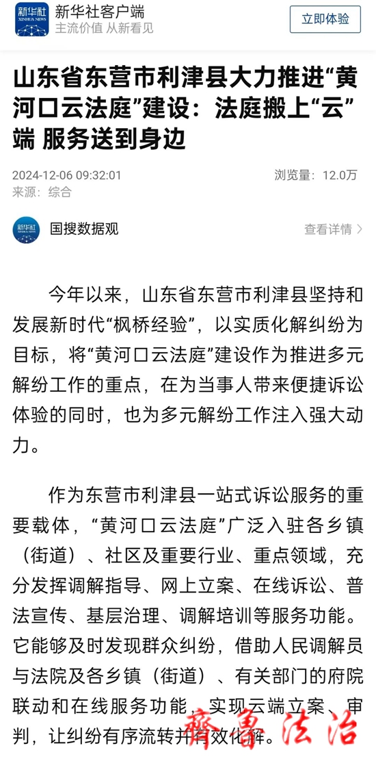 12月6日,新华社客户端以《山东省东营市利津县大力推进“黄河口云法庭”建设:法庭搬上“云”端 服务送到身边》为题,报道东营利津法院“黄河口云法庭”经验做法。