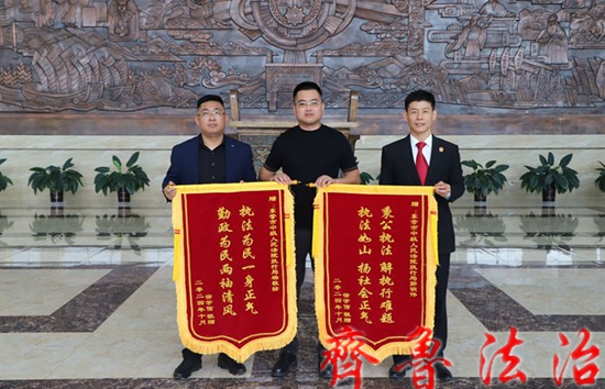 近日,执行案件当事人向东营中院执行局送来两面锦旗,分别为“执法为民一身正气、勤政为民两袖清风”、“秉公执法解执行难题、执法如山扬社会正气”。