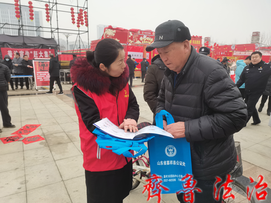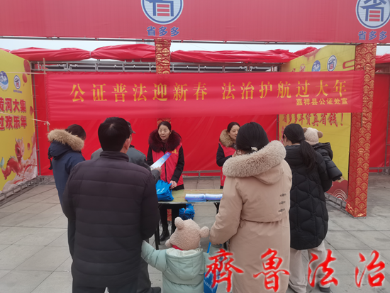 齐鲁法治(济宁讯)于清林 临近岁末,新春将至,街头巷尾的年味越来越浓,为进一步营造尊法、学法、守法、用法的浓厚氛围,增强群众的法治观念和法律意识,1月31日下午,济宁嘉祥县公证处在县体育馆结合全县“黄河大集”反诈宣传工作,开展“公证普法迎新春·法治护航过大年”普法宣传活动。