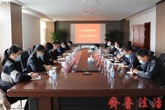 齐鲁法治(东营讯)李春军 为深入贯彻“把非诉讼纠纷解决机制挺在前面”、 进一步优化营商环境,服务保障当地经济大局稳定健康发展,推进金融纠纷诉源治理工作,东营利津法院联合县金融服务中心、公证处召开金融工作座谈会议。县法院审委会专职委员、立案庭庭长雷玉鹏主持会议,县公证处主任周烨,县金融服务中心、金融调解委员会、县辖区内各商业银行分、支行相关部门负责同志及法院立案庭相关人员参加会议。